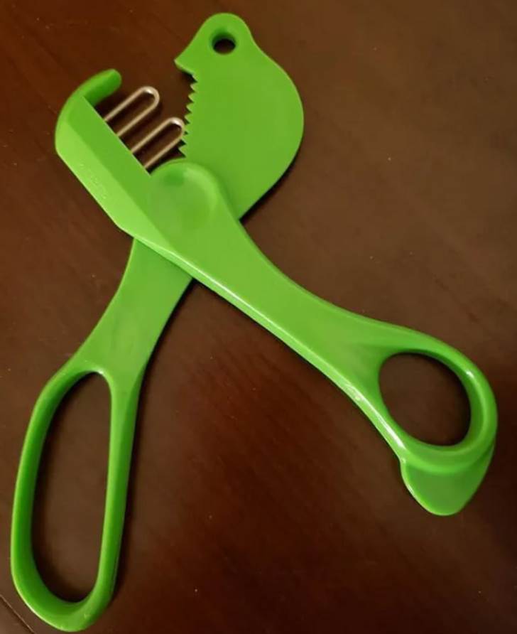 2. “O que é esta espécie de tesoura de plástico verde com alças de metal e dentes também de plástico? Sem marcas de identificação”.